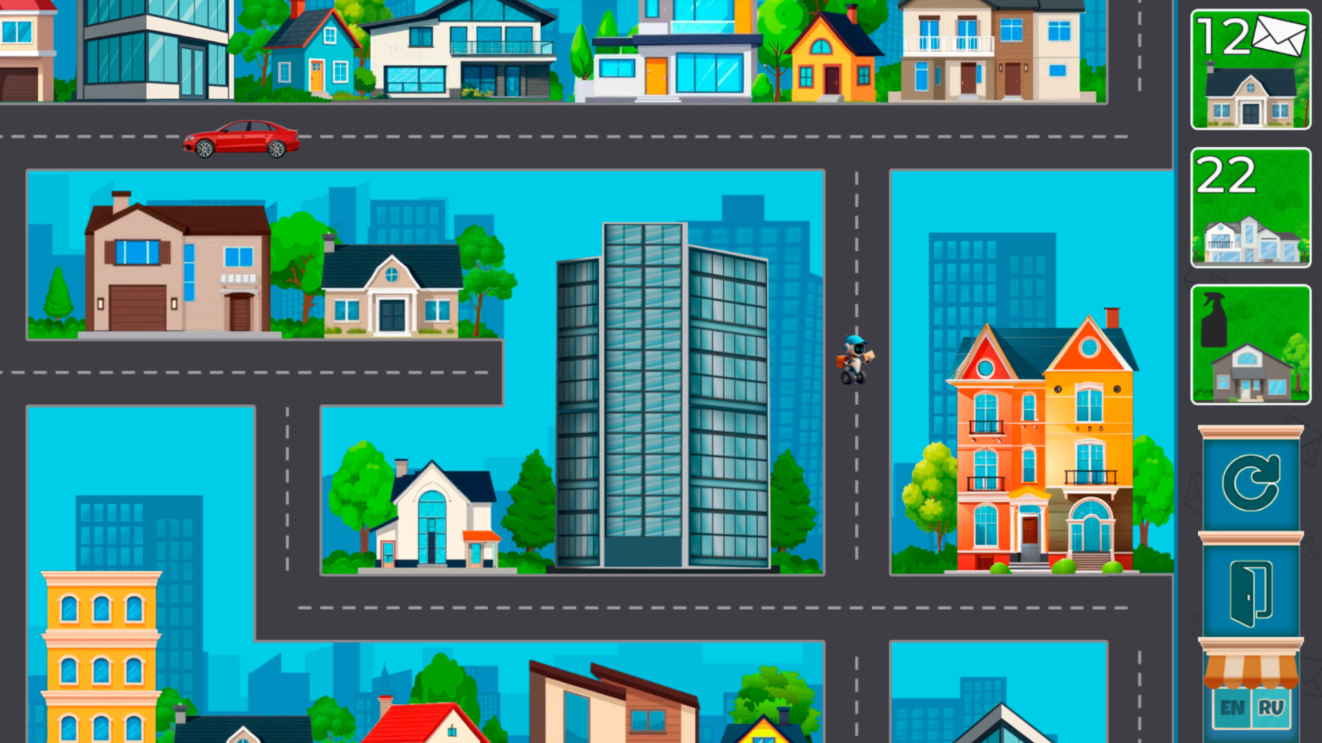 Каждый уровень — это лабиринт улиц и домов. Найди правильный путь сквозь каменные джунгли, преодолей препятствия и выполни все заказы.