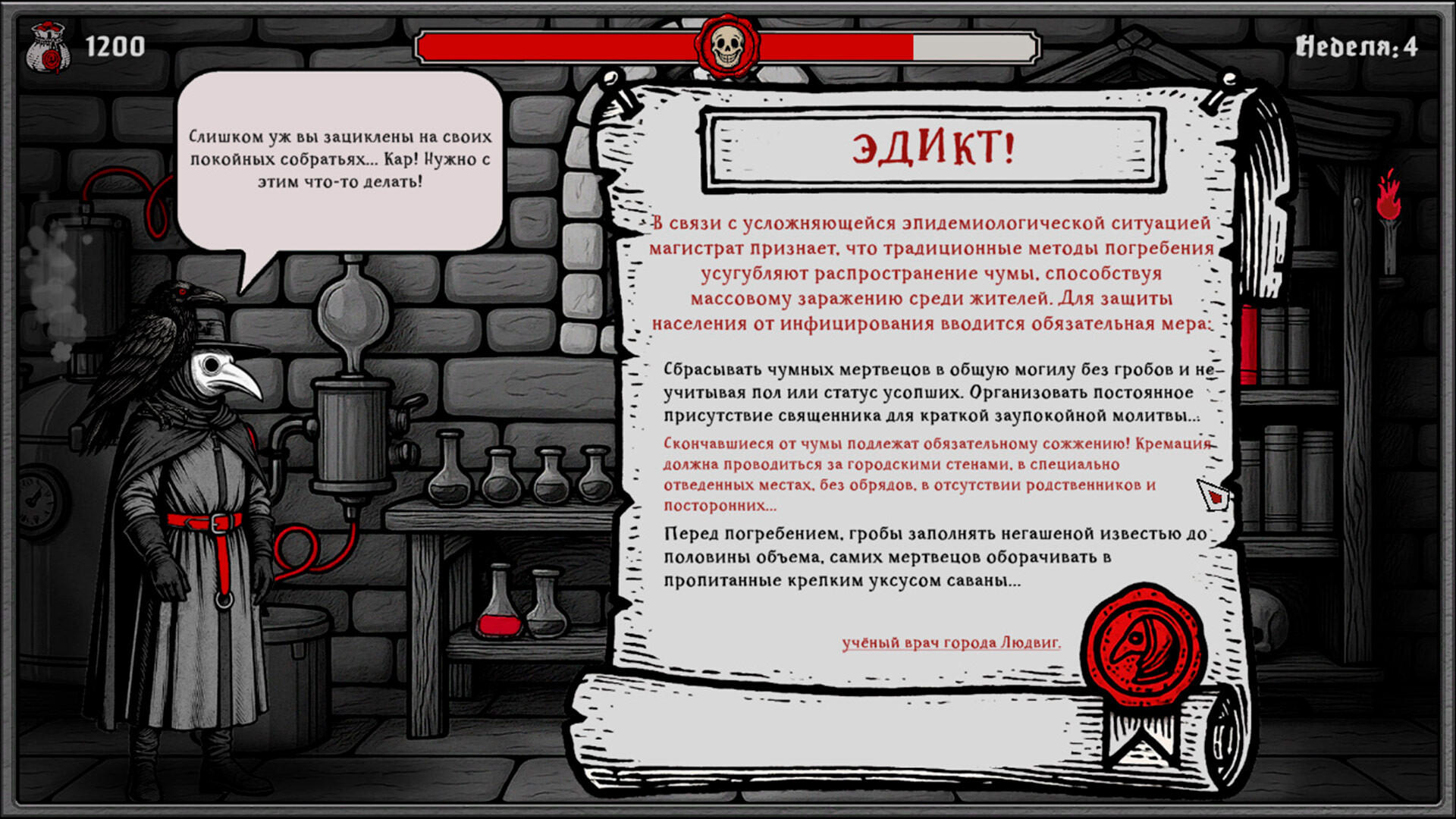 Чума опустилась на город Людвиг. Вы — чумной доктор, последний рубеж между жизнью и хаосом. Войдите в мрачные улочки умирающего города и познайте ремесло врача во времена мора. Диагностируйте, лечите, принимайте жестокие решения. Вводите карантины, сжигайте дома, боритесь с паникой и слухами. Каждое действие имеет цену — не все их переживут...